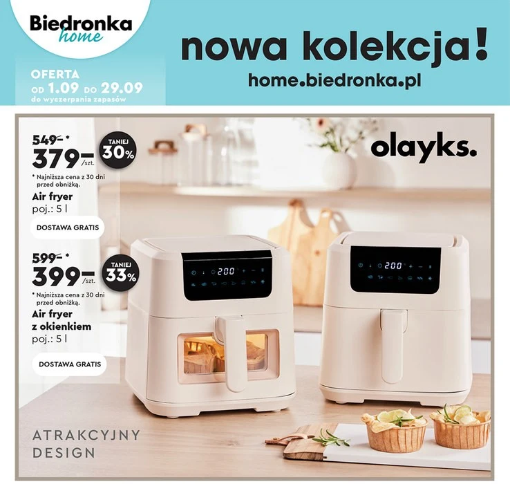 Pierwszy model to klasyczny Air Fryer Olayks, który kosztował 379 zł (czyli około 30% taniej). Drugi, nieco bardziej zaawansowany model, wyposażony w przezroczyste okienko pozwalające podejrzeć, jak rumienią się frytki, był dostępny za 399 zł (obniżka o około 33%).
