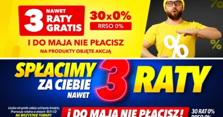 Media Expert dorzuca swoją wersję hitowej promocji. Klienci mogą skorzystać z akcji, w której sklep spłaca za Ciebie nawet trzy pierwsze raty, a całość rozkładana jest na raty 0%. Dodatkowo pierwsza Twoja płatność przypada dopiero w maju - więc kupujesz teraz, a budżet zostaje nienaruszony przez całą zimę.